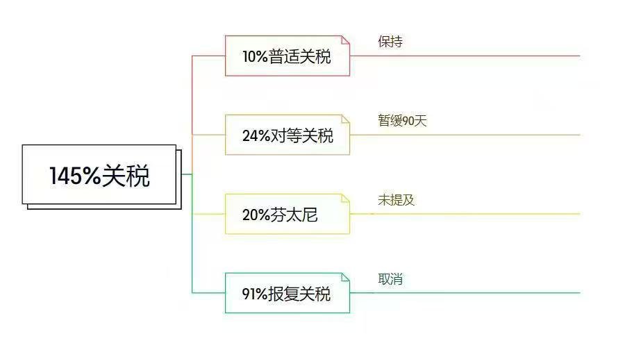如果用一句話總結(jié),就是在5月14日前,中國(guó)對(duì)美國(guó)商品的關(guān)稅從125%降至10%,為期90天;美國(guó)對(duì)中國(guó)商品的關(guān)稅從145%降至30%,為期90天。